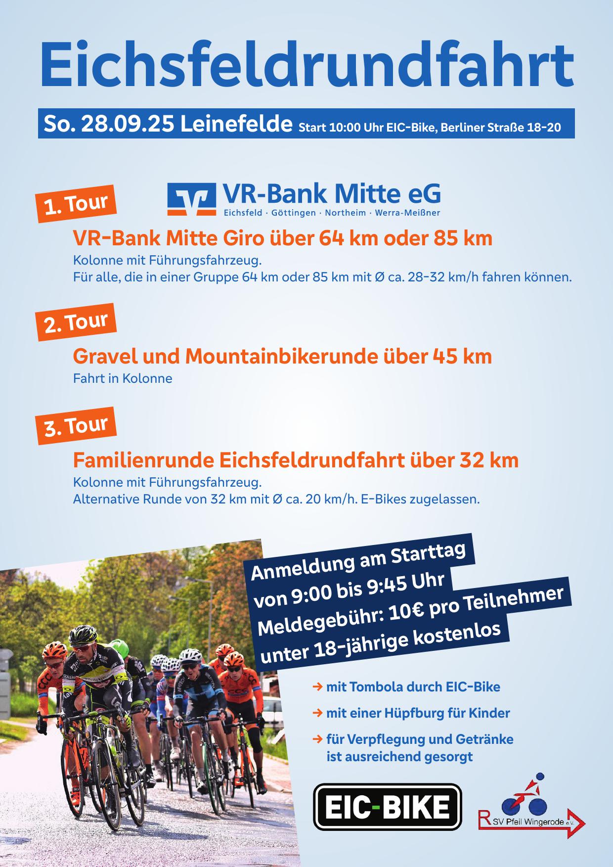 Liebe Radsportfreunde, am 28.09.2025 findet wieder unsere Eichsfeldrundfahrt statt. Dieses Jahr mit freundlicher Unterstützung durch die VR Bank Mitte und EIC-BIKE.